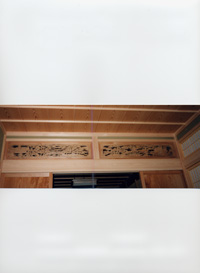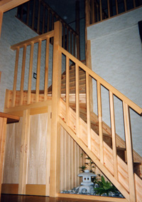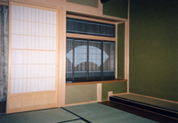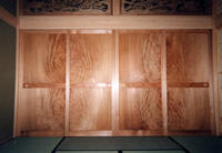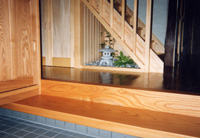 階段下に和風庭園を造り、心安らぐ雰囲気にしてくれます。外観は洋風ですが、部屋は純和風の続き間です。中仕切りは、帯戸は杉一枚板4本引きです。書院障子は神代杉、欄間は近江八景1対2間半タイプです。